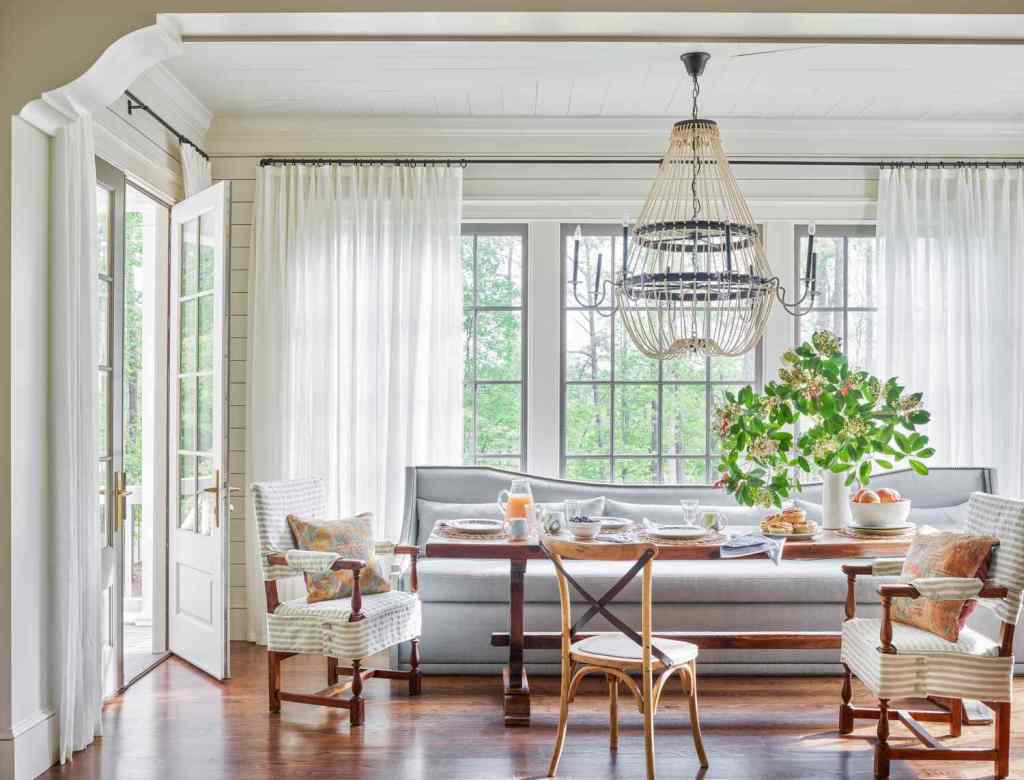 Like any great restaurant, you want your dining area to seem warm and inviting so that both family and friends can come in and have a delicious meal. The secret to capturing that energy? Many thoughtful additions and textures. combines elegant upholstered chairs and pinch-pleat curtains with a cozy couch that invites you to settle down and stay a long.